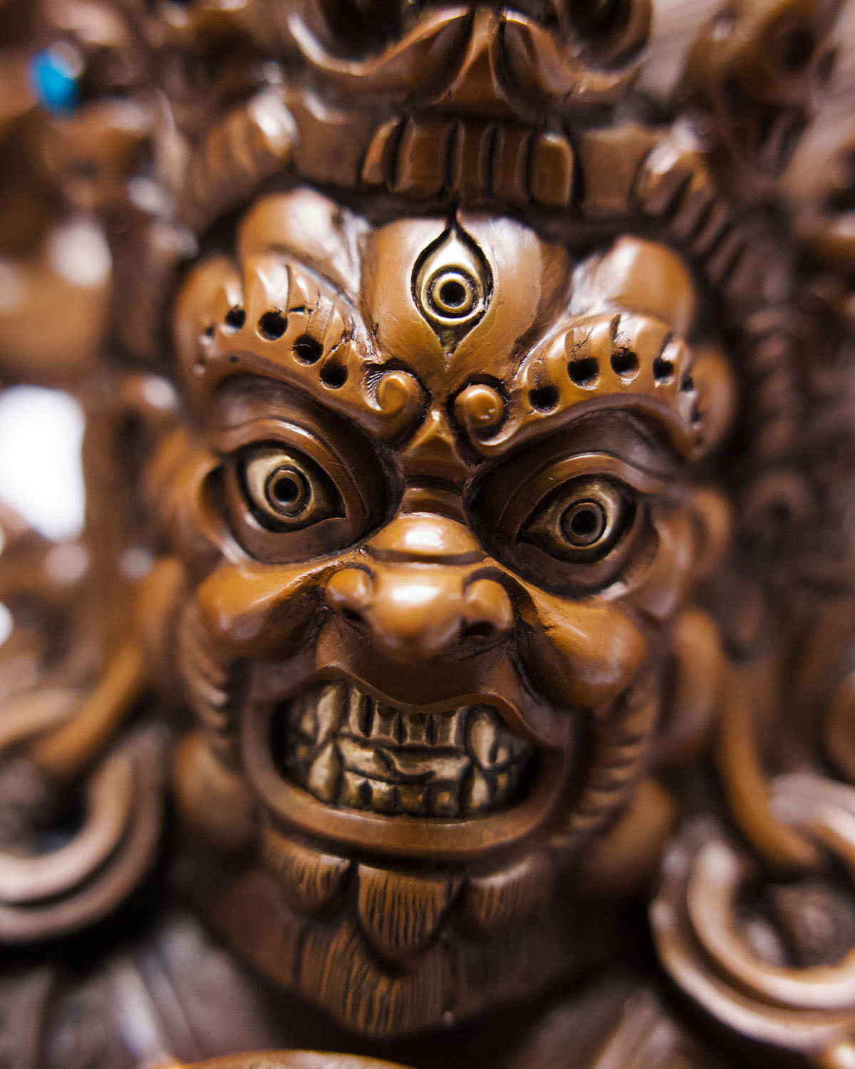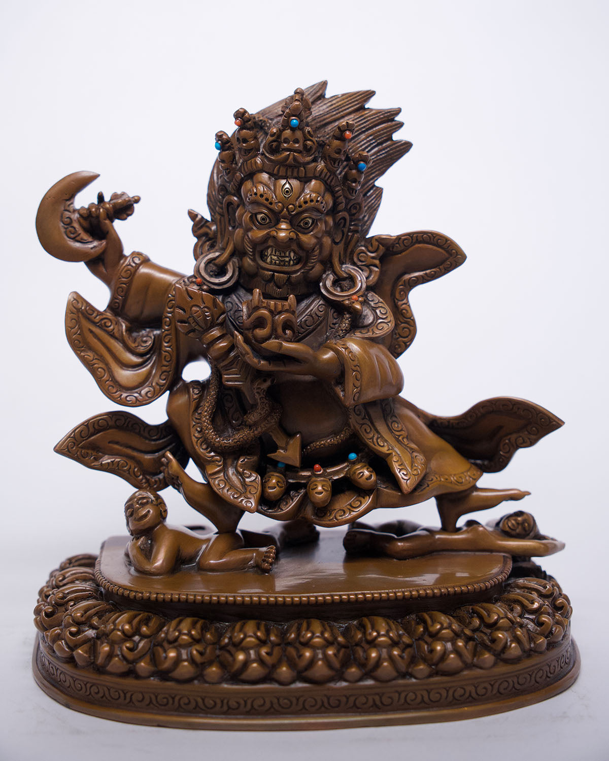 Invoke the fierce protection of Mahakala with this oxidized copper statue. Known in Buddhism as a powerful deity, Mahakala guards against harm and negativity. Perfect for your spiritual practice, this buddhist statue is a must-have for any collector. Available for purchase now.